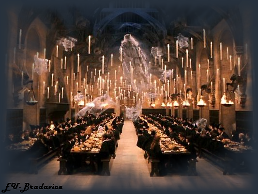 Když vejdete do Velké síně, tak uvidíte dohromady pět stolů. Čtyři z nich, které se táhnou podél zdí a patří jednotlivé koleji a úplně ve předu, čelem ke studentům sedí profesoři, kteří na studenty dávají velmi dobrý pozor.